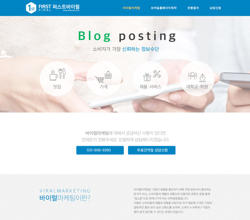 홈페이지에서, 스마트폰에서 모두 잘 보이는 반응형 원페이지 홈페이지 입니다. 랜딩페이지, 간략하게 한눈에 설명하는데 아주 용이합니다.